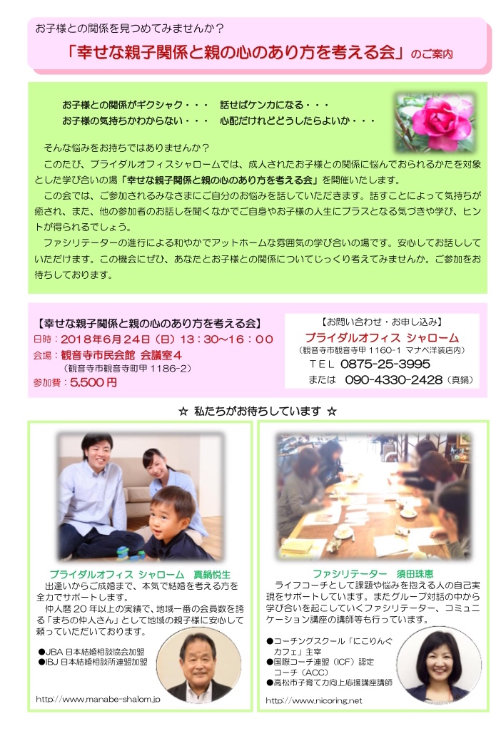 【幸せな親子関係と親の心のあり方を考える会】 お子様との関係がギクシャク… 話せばケンカになる… お子様の気持がわからない… 心配だけれどどうしたらよいか… そんな悩みをお持ちではありませんか? この度ブライダルオフィスシャロームでは、成人された...