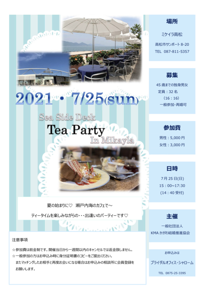イベントのお知らせ ~Sea side deck Tea Party in MIKAILA~ 夏の始まりに♡ 瀬⼾内海のカフェで〜 ティータイムを楽しみながらの・・・出逢いのパーティーです♡ 日時:2021/7/25(SUN)15:00~17:30(14:40受付) 場所:ミケイラ高松 高松... -